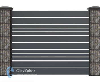 В столбах-габионах использована сетка из прутка 4,8 мм (ячейка 60×200 мм); для монтажа предусмотрен квадратный фланец. Наполнение габионов не входит в комплект поставки.