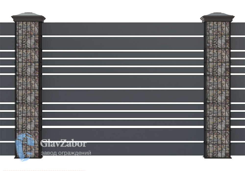 В столбах-габионах использована сетка из прутка 4,8 мм (ячейка 60×200 мм); для монтажа предусмотрен квадратный фланец. Наполнение габионов не входит в комплект поставки.