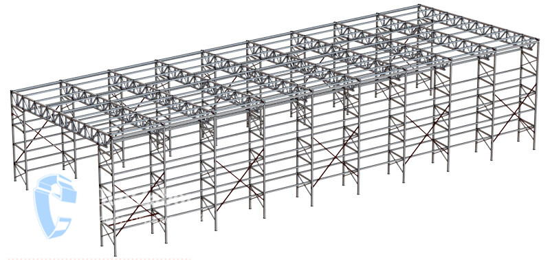 Компоненты склада выполнены из углеродистых труб: фермы — 80×80×3,0; раскосы — 40×40×2,0; балки — 40×80×3,0 и 80×100×3,0.